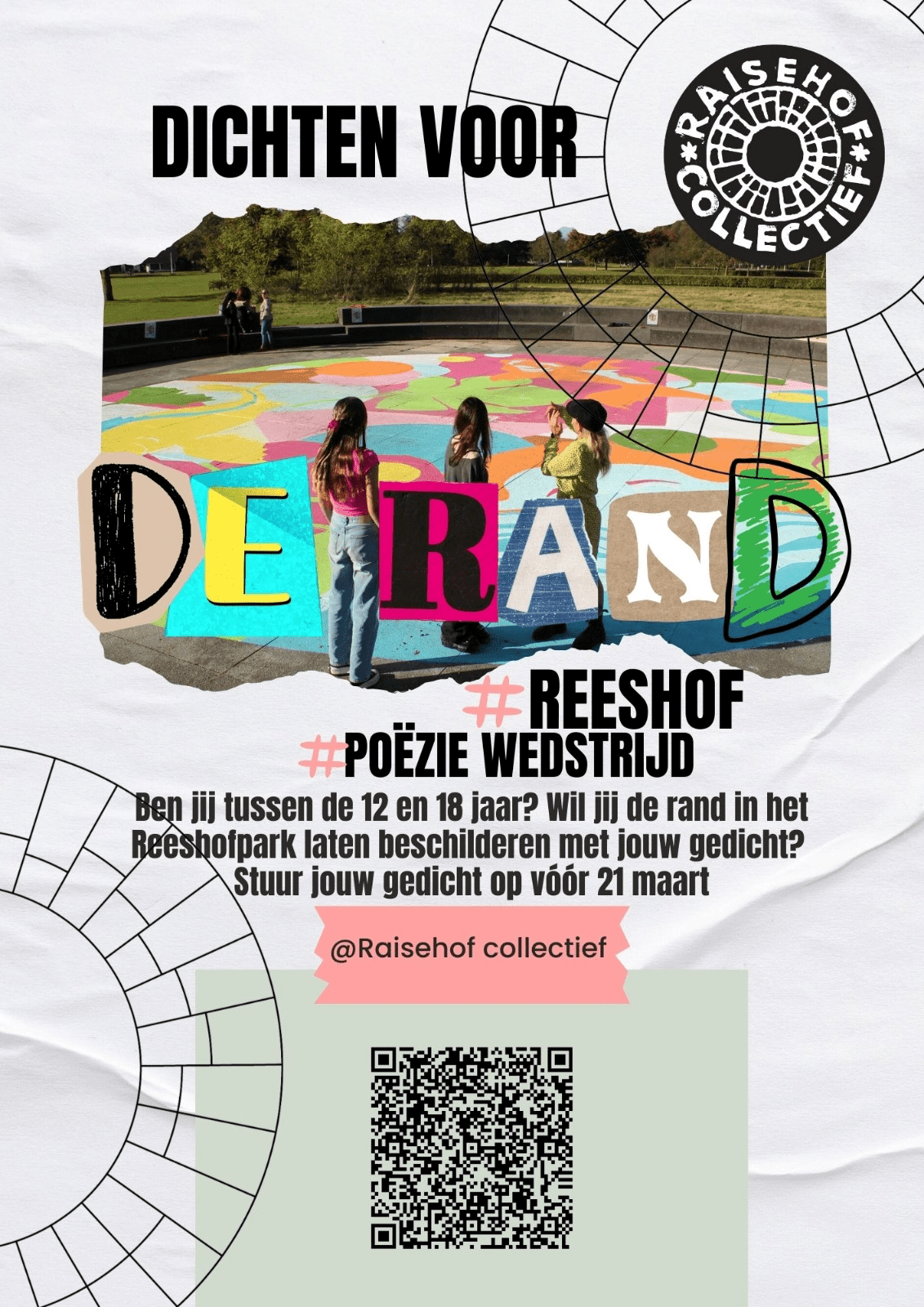 Project 'Dichten voor de Rand' is een oproep aan de jongeren om via poëzie hun stem te laten zien. De open call is gericht aan alle jongeren (12 t/m 18 jaar) om een kort gedicht in te sturen, dat wordt in een muurschilderproject in het voorjaar omgezet in een muurgedicht dat op de rand van het betonnen rondje (de ‘Anus’) wordt geplaatst. Najiba Abdellaoui, de nieuwe stadsdichter, gaat samen met 3 jongeren uit de Reeshof een jury vormen om het winnende gedicht te kiezen. Ook geeft Najiba in het kader van dit project workshops op Beatrix College en in de Bieb Heyhoef.